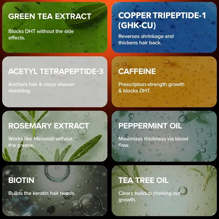 We believe in 100% transparency. Our key ingredients include: Copper Tripeptide-1 (Follicle Support), Caffeine (Stimulant), Rosemary Extract (Botanical Support), Hyaluronic Acid (Hydration), and Panthenol (Conditioning).